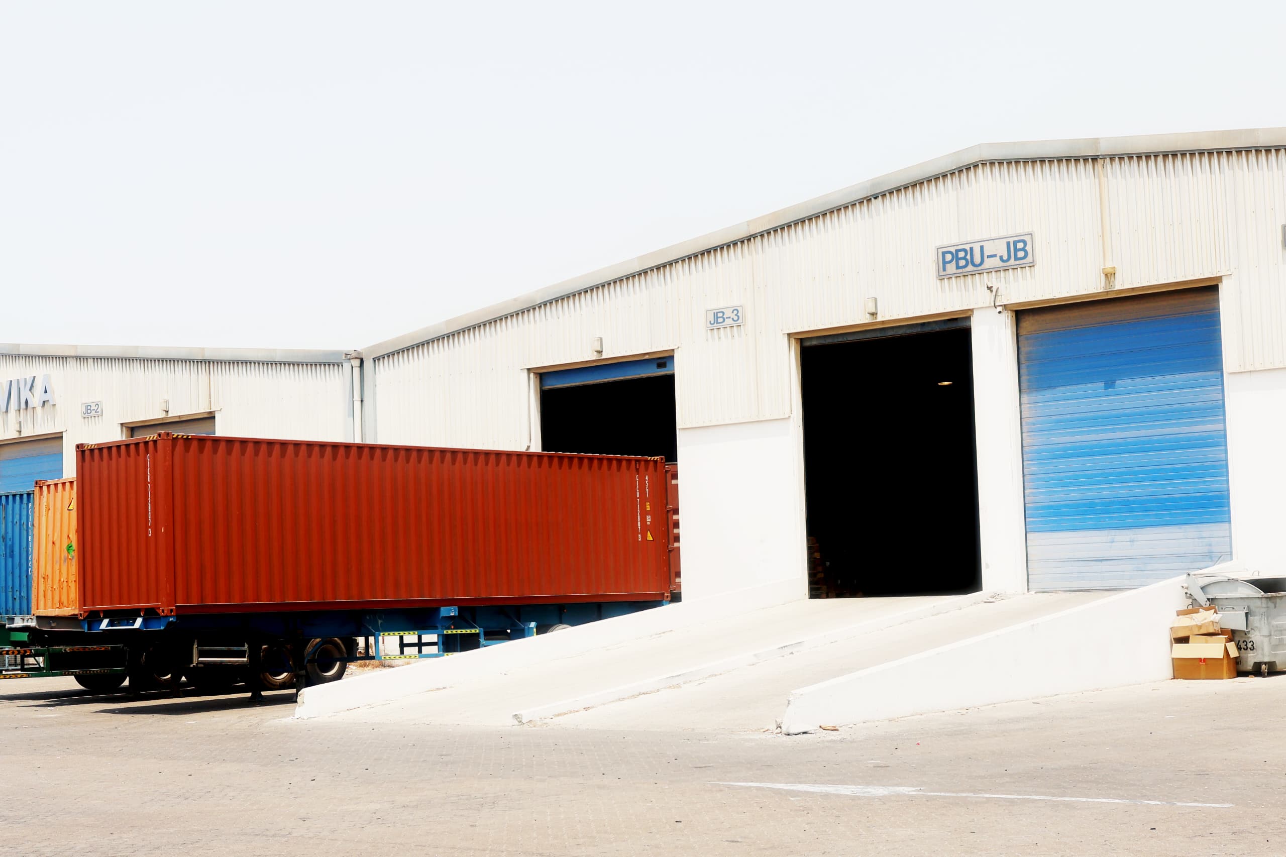 Multiple loading bays and wide access doors allow efficient movement of goods and shipping containers.